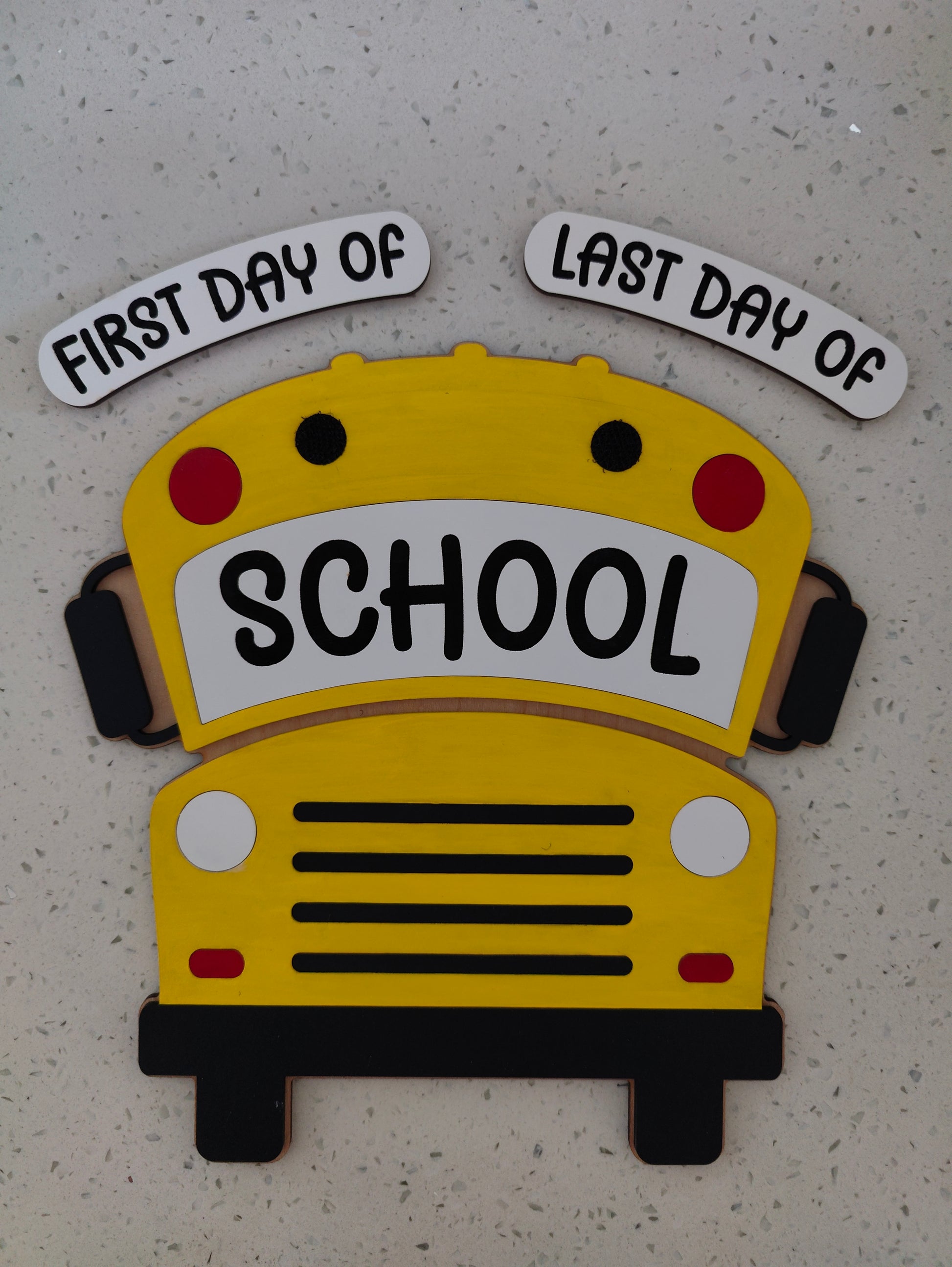 Celebrate the excitement of both the first and last days of school with this fun and interchangeable School Bus Sign! Designed to easily swap out wooden pieces that say “first day of” or “last day of,” it lets you capture those special moments in a playful way. The sign includes Velcro dot backing, making it simple to change the message and display proudly year after year. Perfect for creating lasting memories and sharing smiles, this charming sign also makes a delightful gift for friends and family with kids who love to mark every milestone with a little extra joy.