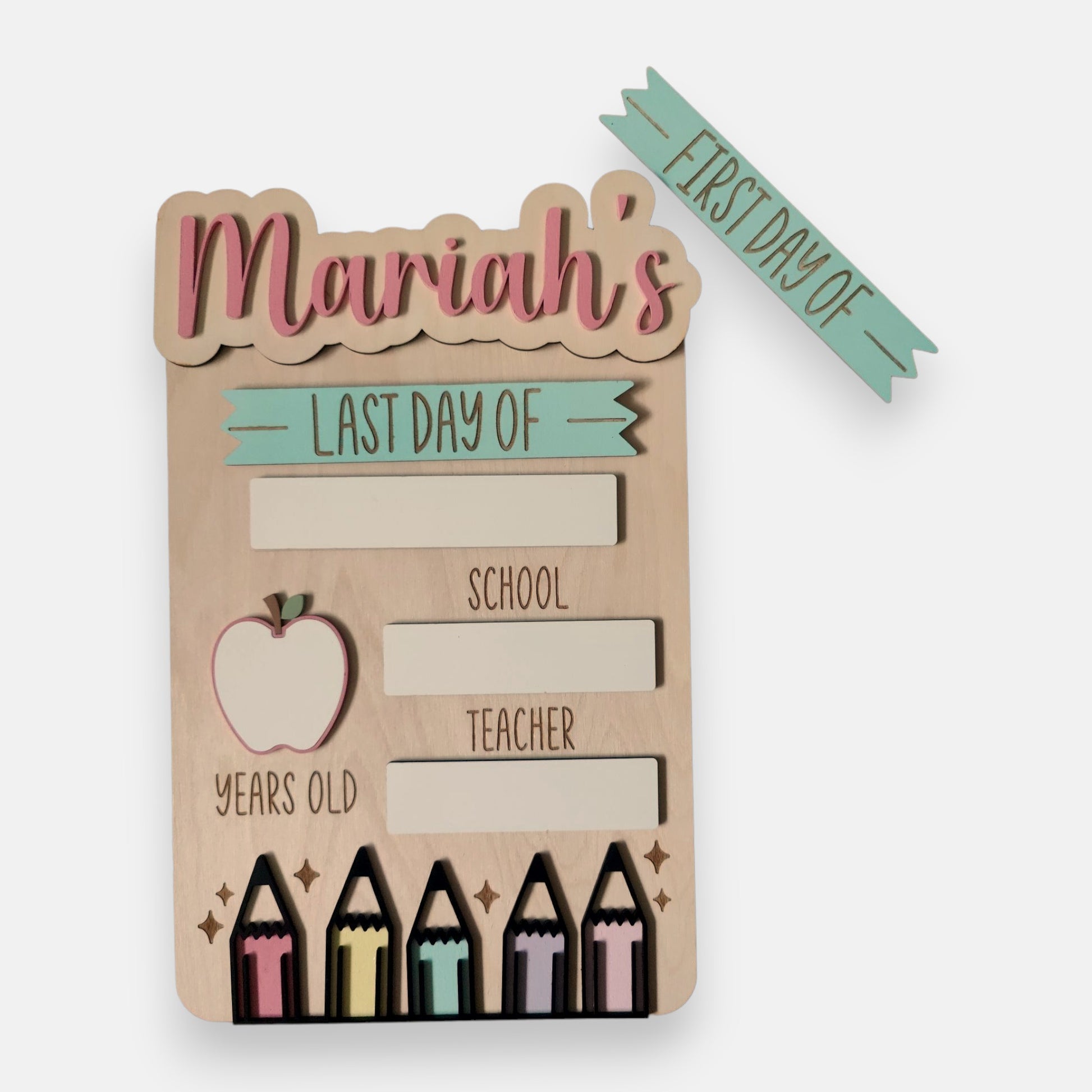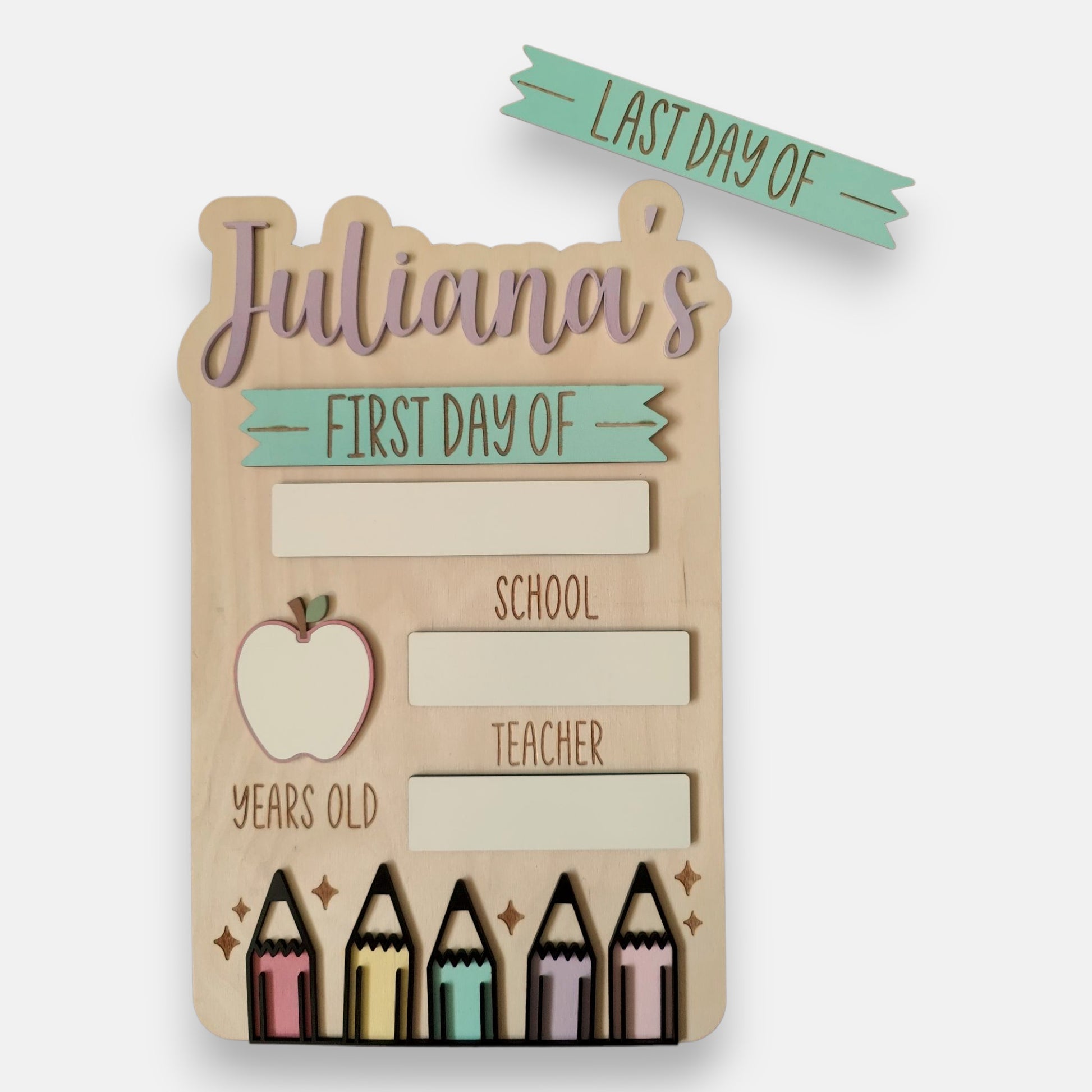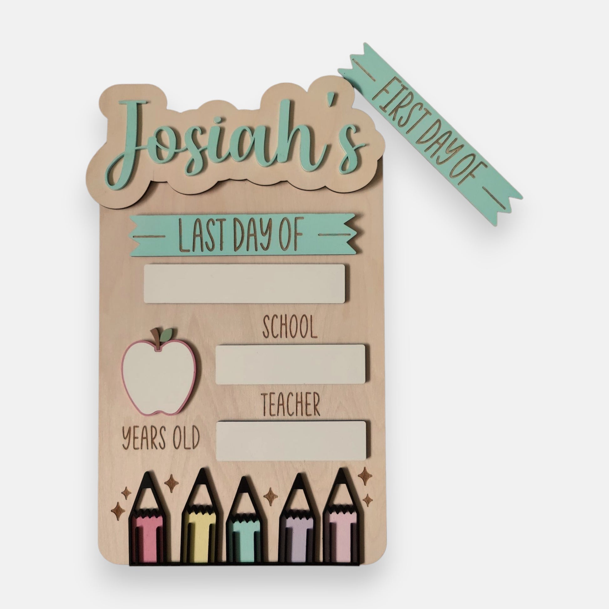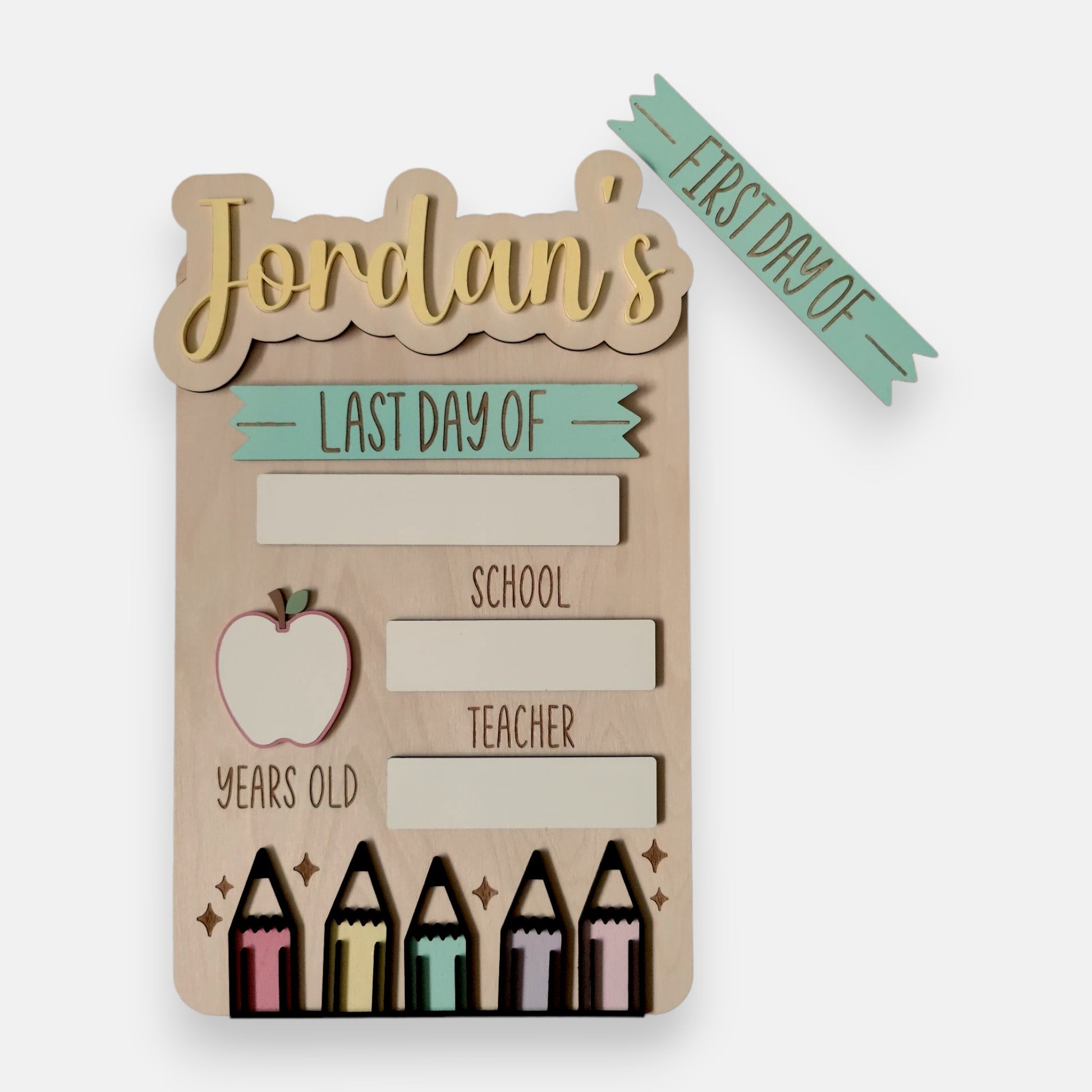 Reminisce about your child's special milestones with the First Day of School Board! Keep this personalized keepsake and take a photo for a lasting reminder of your child's successes and achievements! With this board, you can interchange the "first day of" and "last day of" boards to capture and cherish those memories forever!