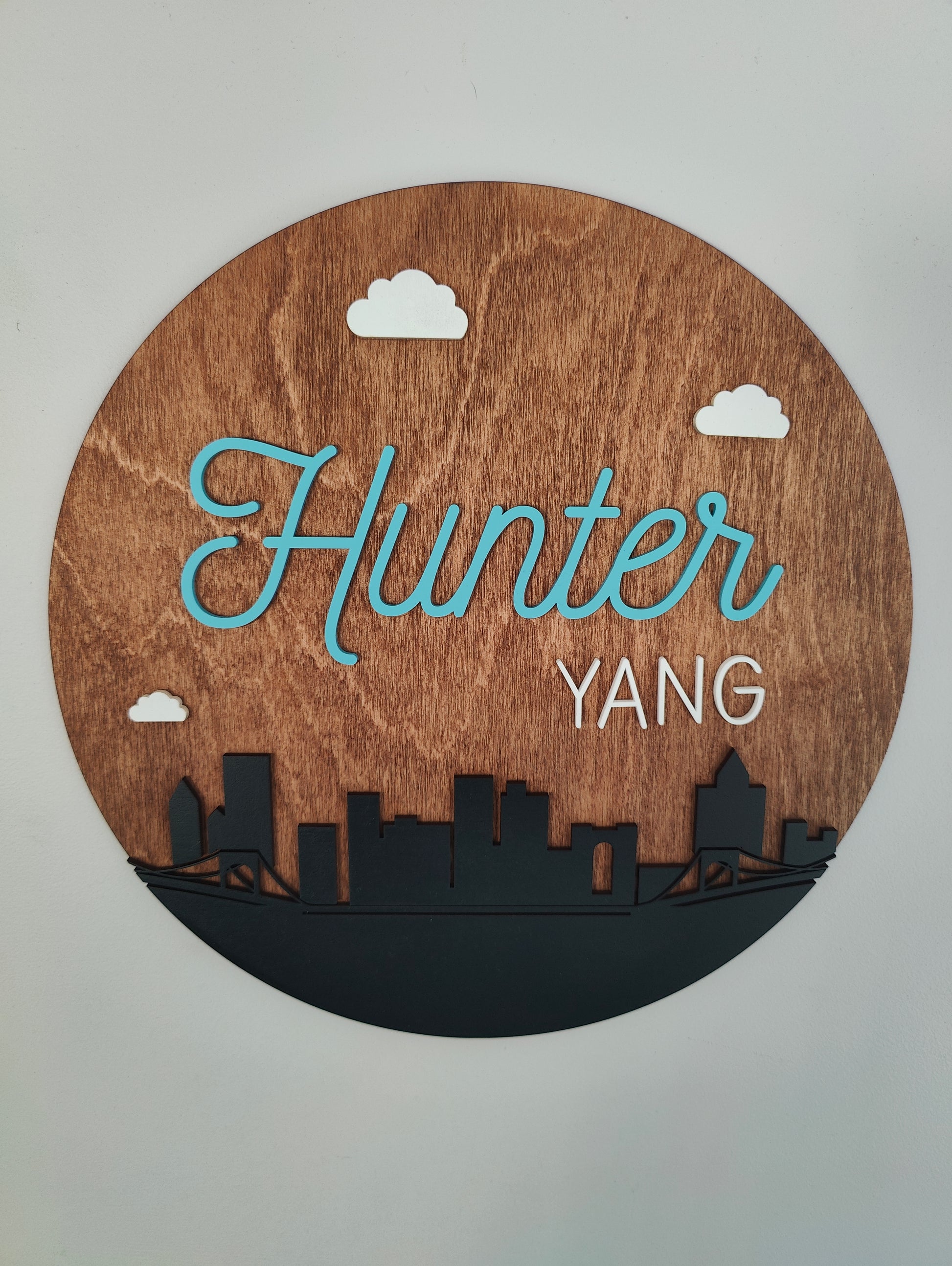 Personalized hand-painted wooden Pittsburgh Pennsylvania city skyline with a custom name in acrylic. This stunning piece captures the essence of Pittsburgh, making it a unique statement for any space.